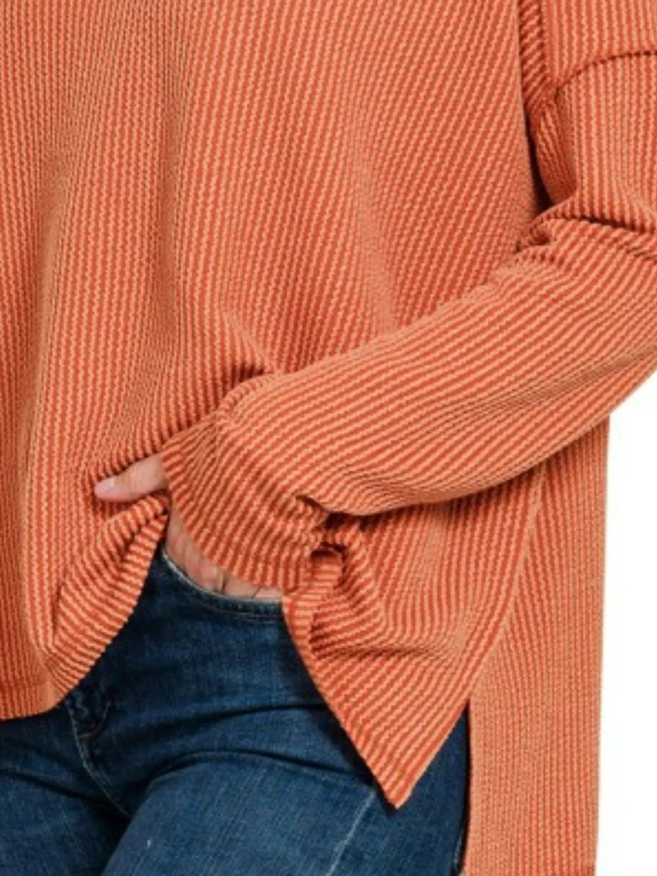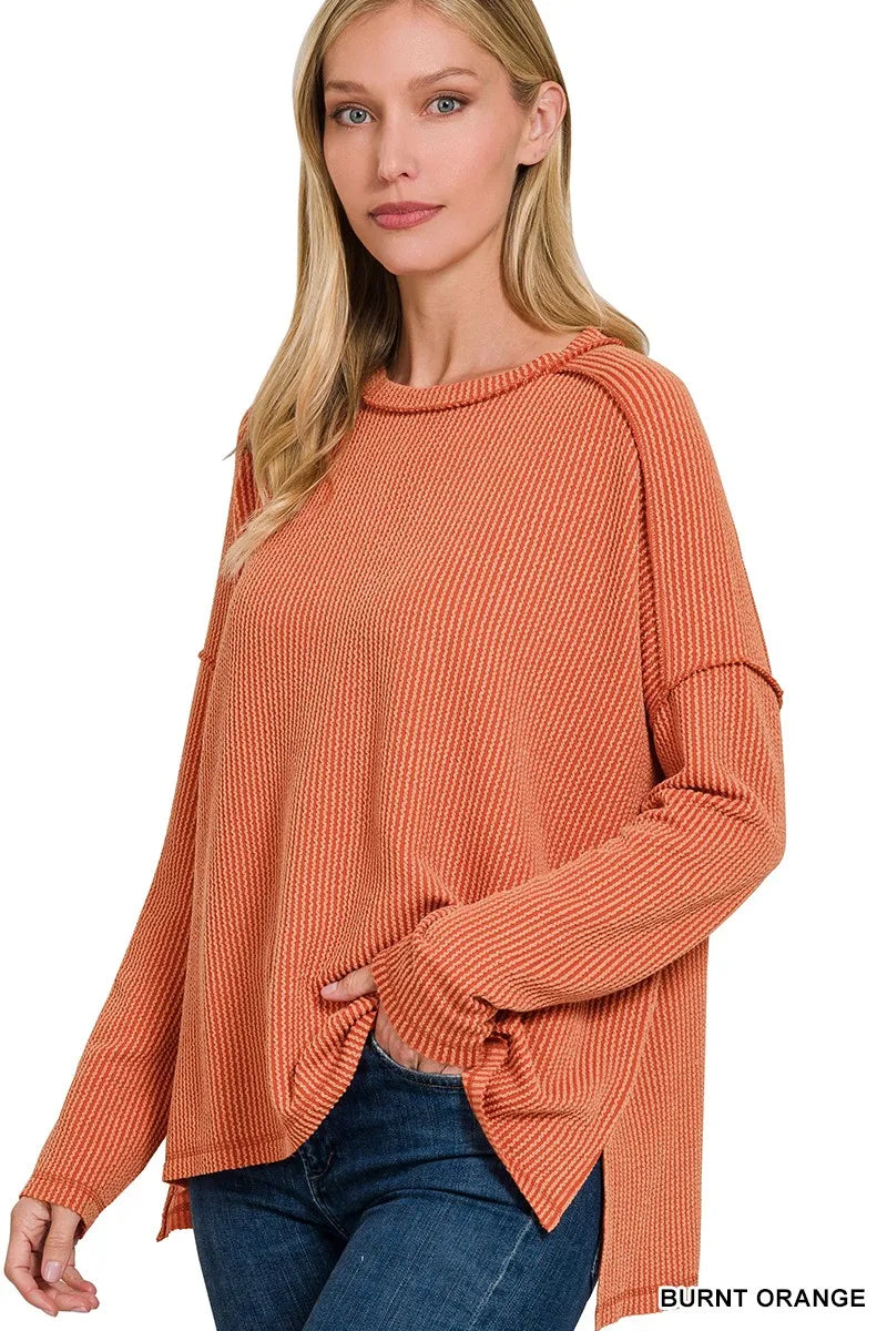 Zenana Exposed Seam Long Sleeve Corded Rib Knit Top