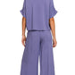 This stylish purple loungewear set features a relaxed-fit top with rolled short sleeves paired with flowing wide-leg palazzo pants. Made from soft, breathable fabric blend that ensures all-day comfort. The elastic waistband provides a comfortable and flexible fit while the coordinated purple colorway creates a cohesive, put-together look. Perfect for lounging at home, casual outings, or as comfortable sleepwear. The flowy silhouette flatters all body types while maintaining a chic, effortless style. Machine washable for easy care and maintenance.