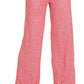 This comfortable two-piece lounge set features a soft pink speckled pattern throughout both pieces. The set includes an oversized short-sleeve top with a relaxed fit and matching wide-leg palazzo pants with an elastic waistband. Made from lightweight, breathable fabric that's perfect for lounging at home or casual wear. The coordinated design offers both style and comfort with its loose-fitting silhouette and soft material construction. Ideal for relaxation, sleepwear, or casual indoor activities.